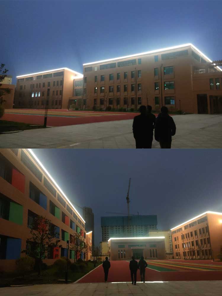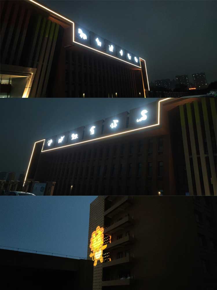 西安市兒童福利院亮化工程,主要是采用線條燈對樓體的頂部和側面輪廓進行勾勒,主樓安裝十二生肖發光造型,側墻采用圖案燈進行動畫投影,打出絢麗多彩的動畫卡通人物,與建筑的實用完整結合。