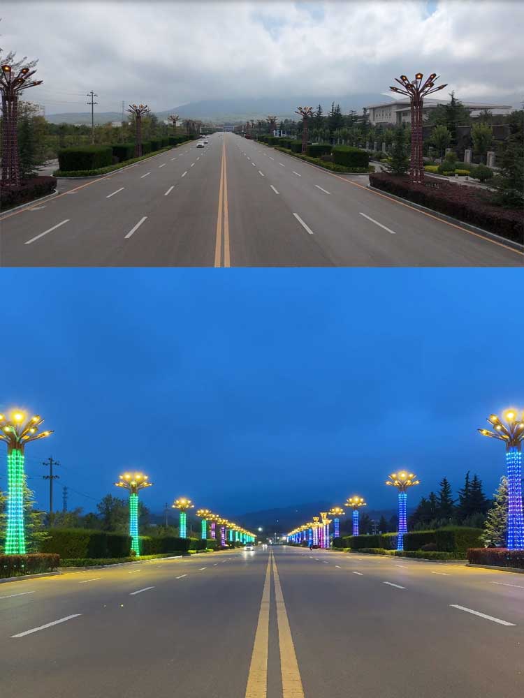 簡(jiǎn)介—— 甘肅平?jīng)?米景觀燈項(xiàng)目,安裝位于崆峒山下的市政道路倆側(cè),主光源采用16個(gè)LED模組光源組成,配合燈體400的RGB點(diǎn)光源構(gòu)成,系統(tǒng)采用512控制,夜晚整體趁現(xiàn)炫彩效果,亮化倆側(cè)道路。