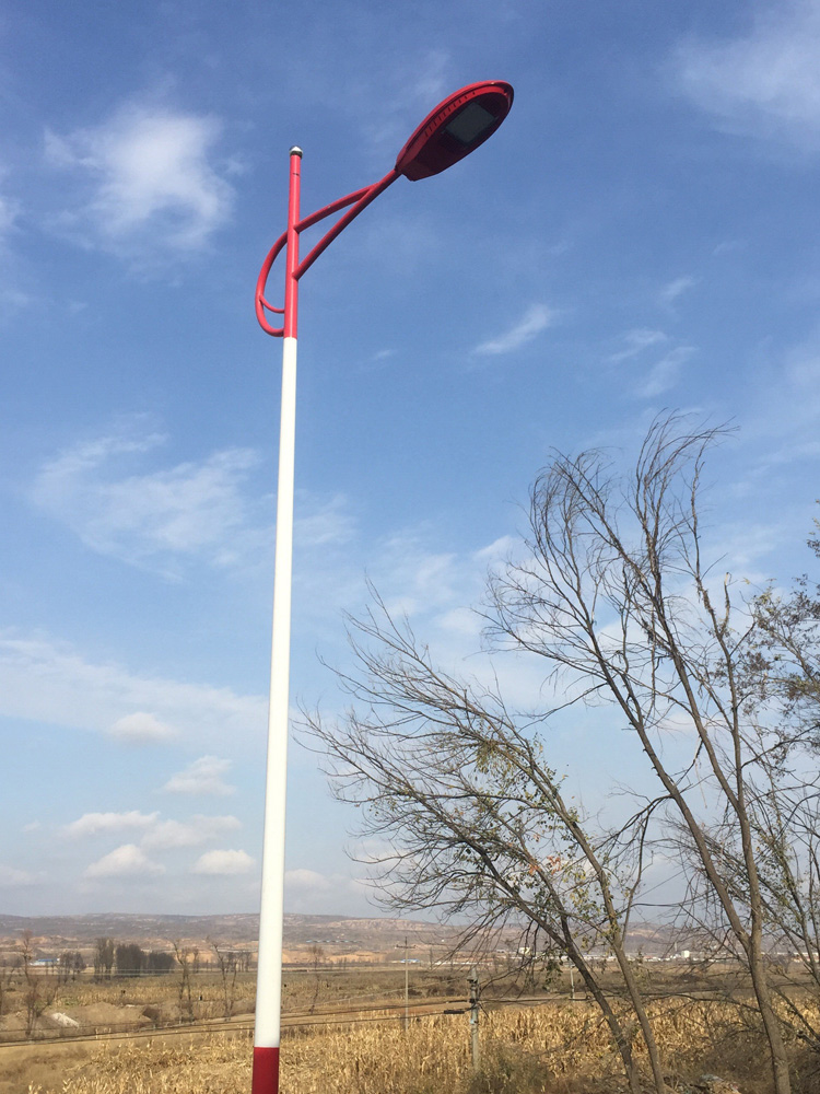 簡介—— 陜西榆林市橫山縣泗源溝村農村太陽能路燈工程,泗源溝村保存著較為完整的鄉土文化,地處黃土高原與毛烏素沙漠接壤處,北望遼闊的沙漠,西靠雄厚的黃土高原之山脈,東臨著名的無定河。村莊采用的是我蘭光照明的6米高市電路燈,顏色為紅色為主,為村莊增添了不少喜慶氣氛。